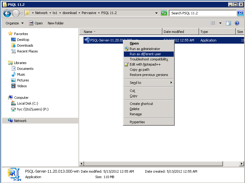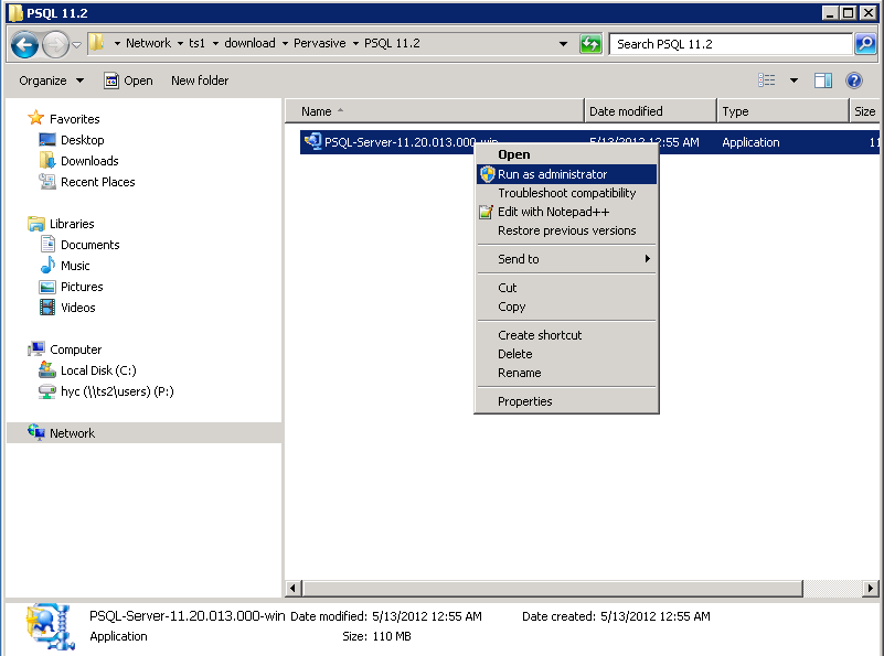 A - As you know, installing PSQL Client requires administrator or equivalent privileges on that workstation. If you already logged in on the workstation as the administrator or an equivalent user, then the right click to "Run as Administrator" procedure should work.