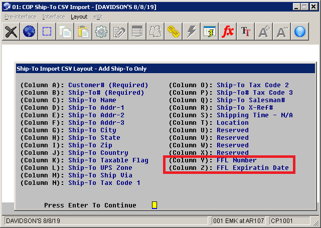 This utility was not available with Elliott Firearms Industry add-on software because there are custom fields like FFL Number and Expiration Date which are not supported with the standard utility. Starting with Elliott 8.5, we are now supporting the importing of ship-to records for the Firearms Industry software by adding the support of FFL Number and Expiration Date columns. See layout sample screen below: