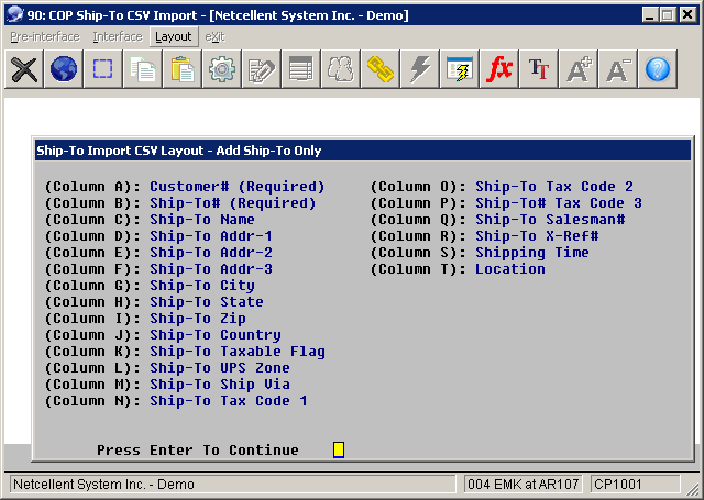 There has been a ship-to CSV import utility in Elliott Business Software for many years. You can access it from COP -> Maintenance -> Ship-To File -> Import. This utility allows users to add new ship-to records for a customer from a CSV file. This is very handy when you are adding a customer with many store locations. It is especially useful with EDI scenarios. The following is a sample screen of the layout for the CSV file: