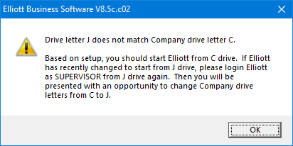 The issue may stem from the Tutorial company. If the company was never used in Version 7, it may still contain the default drive letter of C:. Elliott 8 will use the first company listed to determine the data drive letter and they may conflict with the drive letter configured in the shortcut. You can log into Elliott as SUPERVISOR and a prompt will appear to allow you to change the drive letter or you can simply rename or remove the TUTORIAL folder if it will not be used.