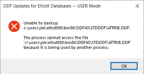 In this example, DDFUPD was started in USER mode. Here, ATTRIB.ddf is being used by another process, so it cannot be backed up prior to updating it. The process has stopped trying to update .DDF files. You must press the OK button to continue. Follow the instructions to stop the database server (removing busy status from any .DDF files) and try again.