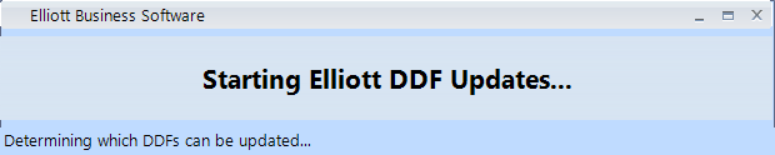 These folders should never be busy because no SQL databases should point to them. The Elliott install automatically launches "DDFUPD /i" to run DDFUPD as part of the install. In INSTALL mode, the DDFUPD user interface is normally hidden and only the progress screen is shown, with information about the progress of the update, e.g.: