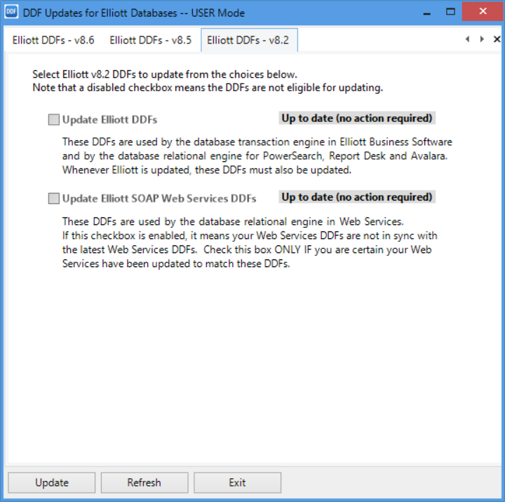- The checkboxes are enabled (as above) if the latest .DDFs are different from their current .DDFs and an update can be applied; otherwise they are disabled and a status message is shown.