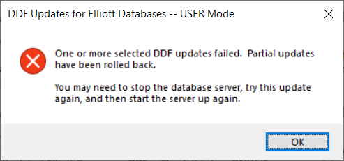 Certain errors that may be encountered are self explanatory and simply must be acknowledged by pressing the OK button. Others may be more complicated. If it is not clear what to do, we suggest you contact your software or database administrator for help. If you administrator does not know how to resolve the issue, he/she should contact Elliott support. When in doubt, roll back any updates and get some help.