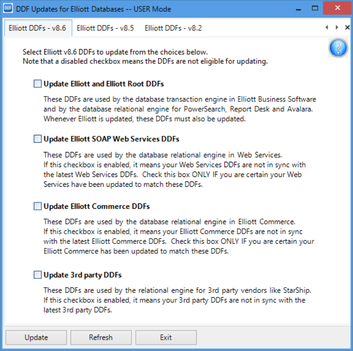 - For this v8.6 tab, there are four kinds of DDFs that can be updated and each has a checkbox and a detailed description.