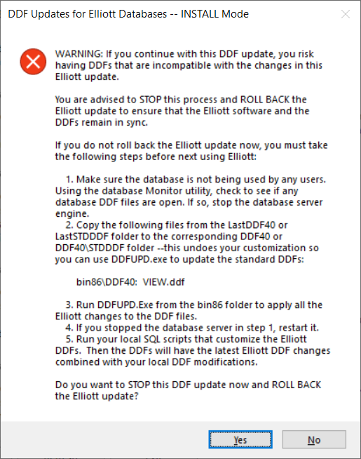 If you do not understand this situation, you should press the Yes button to roll back any DDF updates and roll back the Elliott install itself. A software or database administrator instead may choose to follow the step-by-step instructions given here to complete the DDF update and reapply any customization scripts.