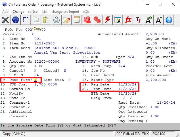 When someone looks at the ATP, they need to know whether the promise date has been confirmed by the vendor again so that we can rely on that date. If it has not been confirmed, you should enter “N” in field 9. Date Firm?, which will corresponds to ATP Type “P?”