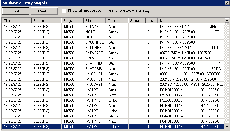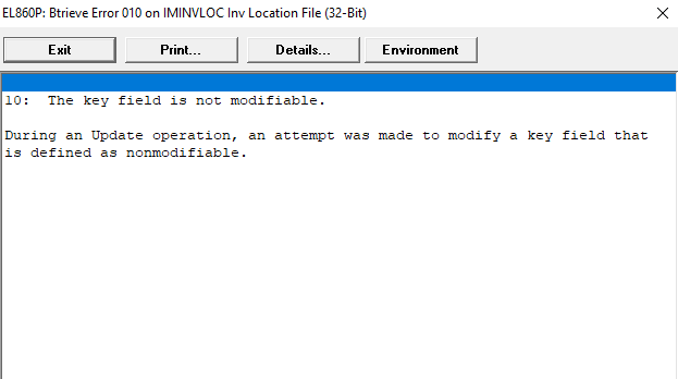 A - If you replicate this problem, then when the message “EL860P: Btrieve Error 010 on IMINVLOC Inv Location File (32-Bit)” “10: The key field is not modifiable” message shows up agai click on the “Detail” button. You should see a list window like the following: