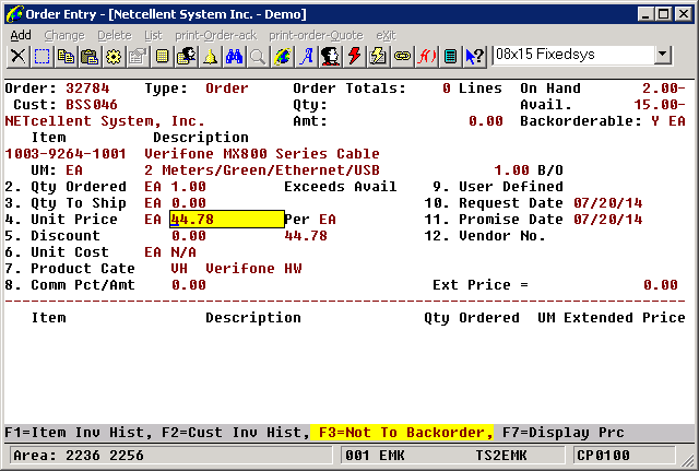 As shown in the example above, if the user presses "F3=Not To Backorder" in the "Unit Price" field, then the line item becomes an item that cannot be backordered. A user can do this, even though this item can actually be backordered. This type of situation might occur if a customer chooses not to be on backorder for an item, even though the item itself can be backordered.
