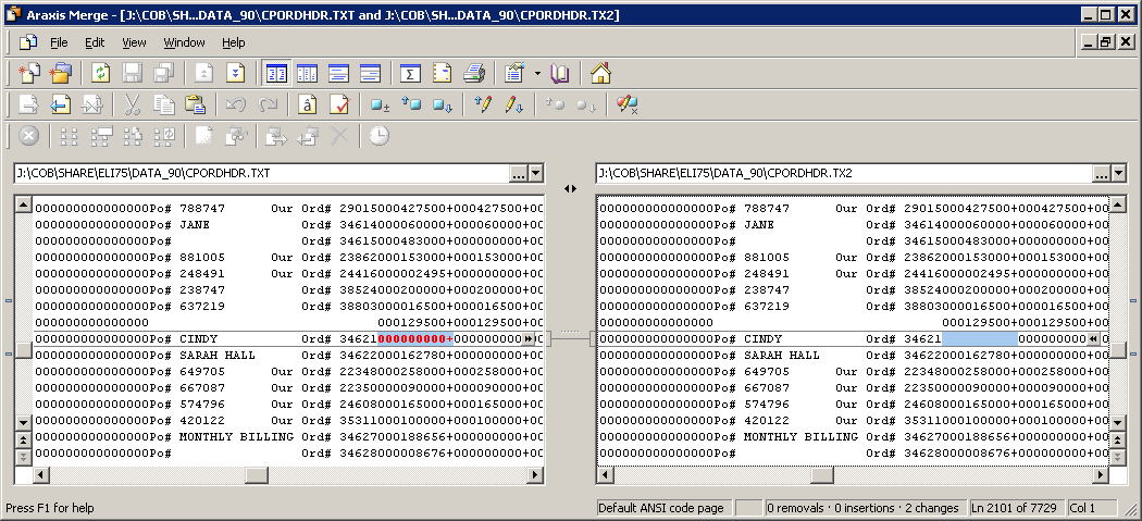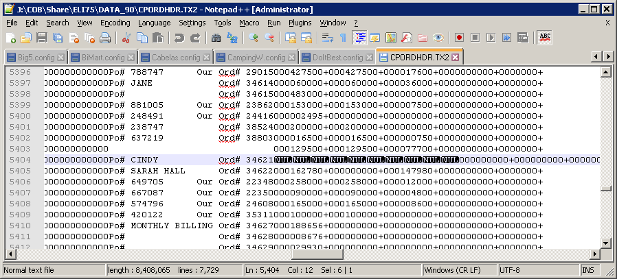 We verified that these are the orders that do not have any line items. Then we used Notepad++ to look at the CPORDHDR.TX2 and found that the blank spaces are actually NULL characters. See sample screen below: