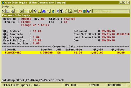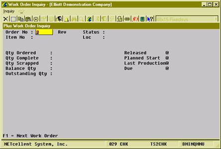 A work order number must be specified unless you have drilled down to Work Order Inquiry from another interface, ex. Sales Order Inquiry. All the information about the work order will be displayed.