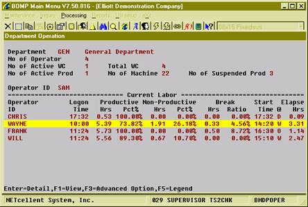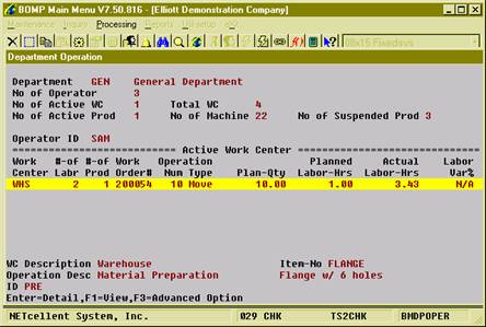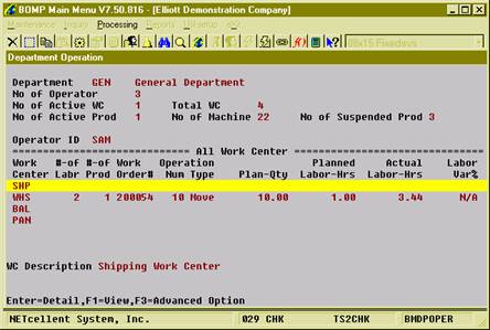 If you drill down from another interface where the Department ID and Operator ID are given, the first two stages are skipped. Once you are signed in, the system will display general department and shop statistics on the top 4 lines and view information below the double-line separator. Similar to Work Center/Operator Inquiry, this interface has three views which can be toggled with the F1 Key.