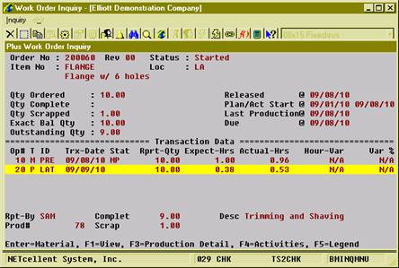 Basic information from the work order header will be displayed on the top four lines, including item number, production location, order status and revision number. If this work order was copied from a COP order, sales order information will be displayed on the top-right side. The middle of the screen displays numeric statistics about the order, including quantity ordered, quantity completed, balance quantity, planning start and due dates, and actual start date. “Balance Qty” is for orders where the ordered quantity is not an exact quantity. “Exact Bal Qty” is for orders where the order quantity is an exact quantity. Balance Quantity of an order is the difference between quantity ordered and quantity reported. If order quantity is an exact quantity, balance quantity is ordered quantity minus completed quantity. Otherwise, balance quantity is ordered quantity minus completed quantity and scrapped quantity. “Outstanding Qty” is the number of pieces that have been started but not yet finished.