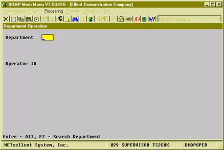 Main Menu -> Distribution -> Bill of Material Processor -> Maintenance -> Department Operation
