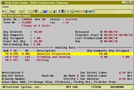 Below the numeric statistics is a view of the work order. Like many other interfaces in WO+, Work Order Inquiry has three views, Routing View, Bill of Material View and Production Transaction View. Use the F1 Key to toggle between these views.