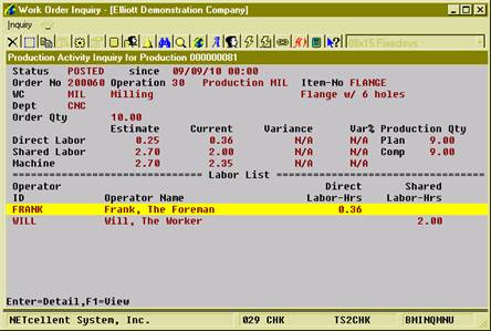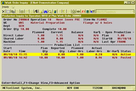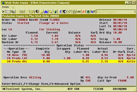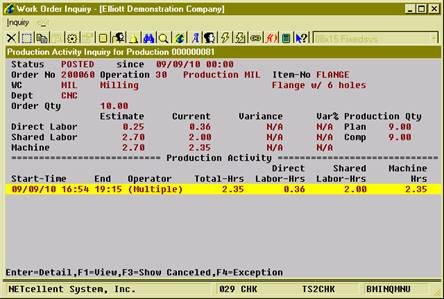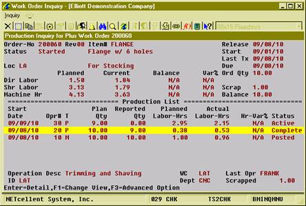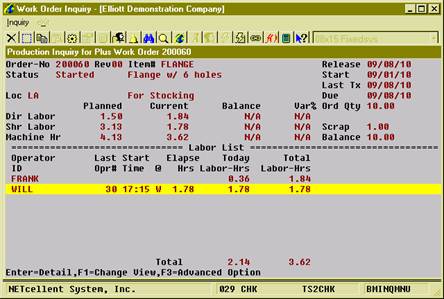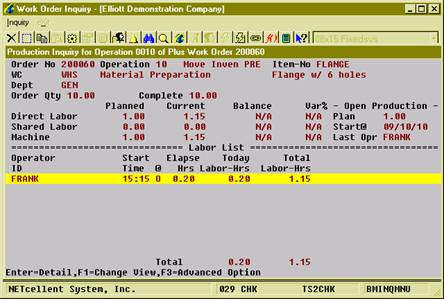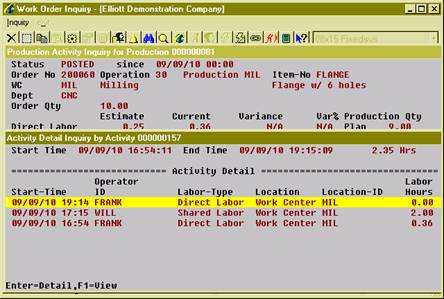 This interface cannot be accessed through any Elliott menu selection, but you can drill down from another interface, like Production Inquiry for Work Order or the Advanced Options in other interfaces.